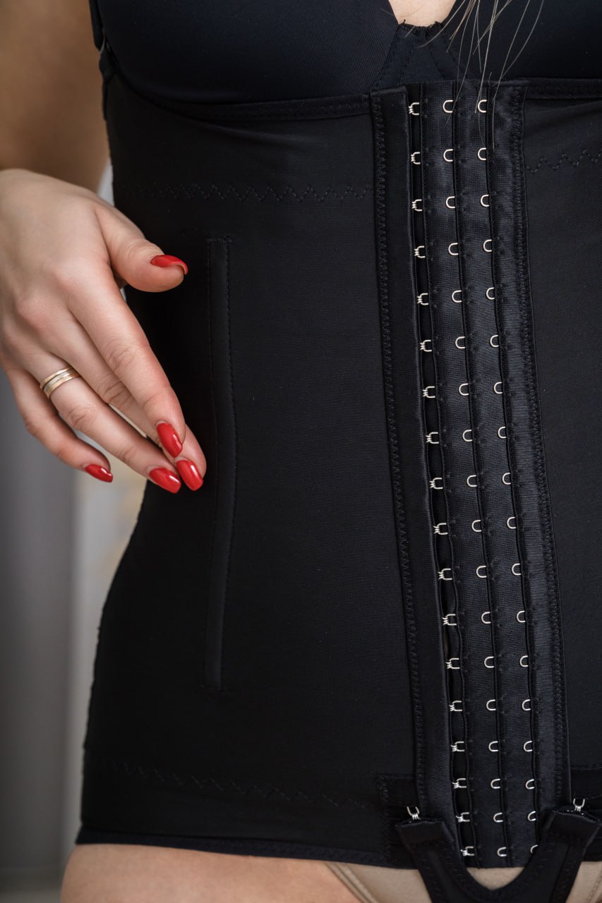 корсетная часть более мягкая, он не имеет «косточек», но за счет компрессии ткани и конструкции великолепно разглаживает мягкую жировую ткань.